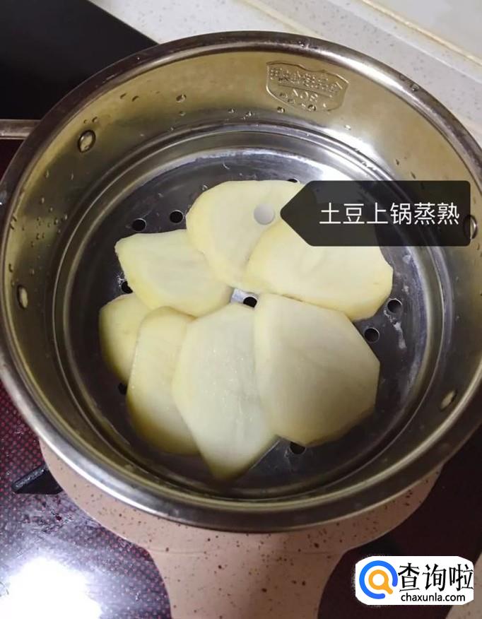 然后将土豆去皮切成薄片,上锅蒸熟,如下图所示。