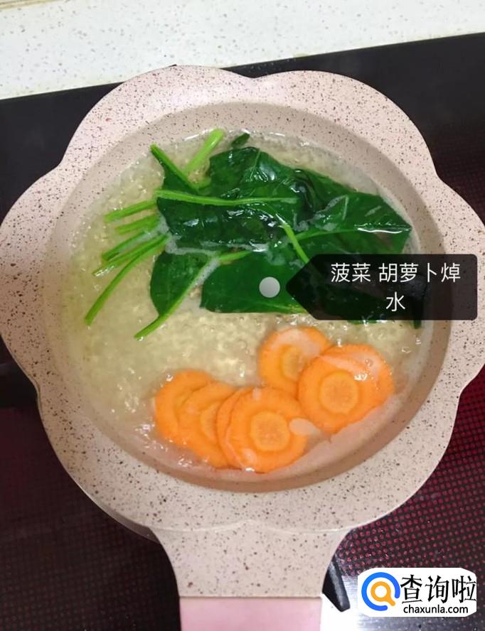 接着锅中放入适量的清水,待水烧开,倒入菠菜和胡萝卜焯两分钟,捞出控干,如下图所示。