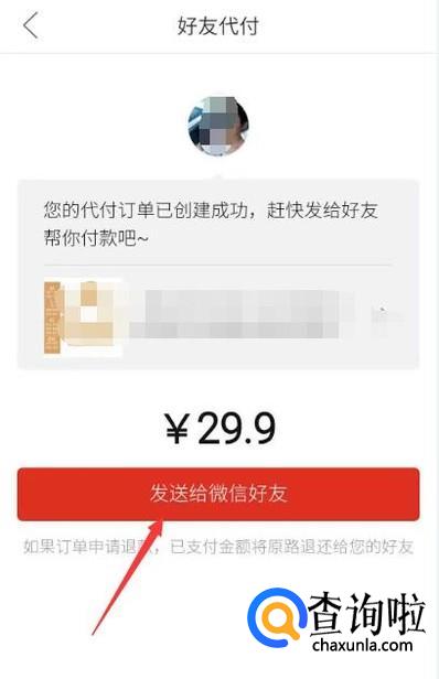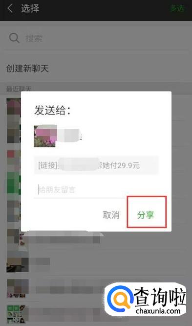 进入微信好友页面后,选择你要分享给那个好友,点击好友头像即可,然后点击“分享”即可成功邀请好友帮忙代付。