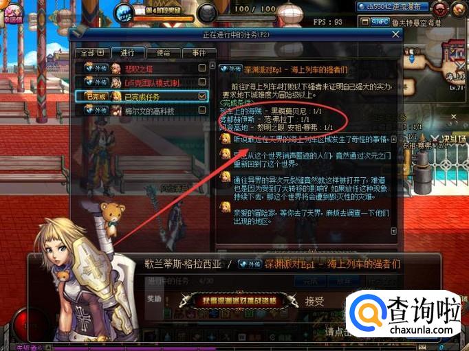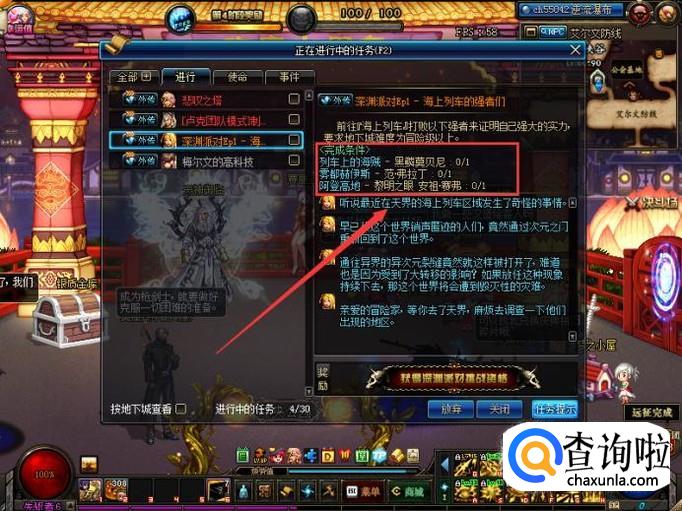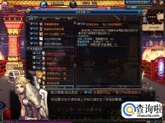 首先我们进入游戏,按F1呼出任务菜单,找到歌兰蒂斯的海上列车深渊任务并接取。