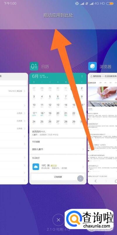 首先从手机桌面底部上滑,呼出多任务界面。然后点击进入左上角的“分屏模式”。
