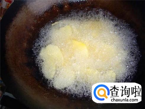 锅里放油,烧热之后把土豆片放进锅里炸,一边炸一遍翻几下免得炸的不均匀。