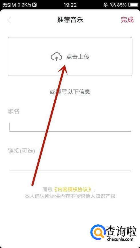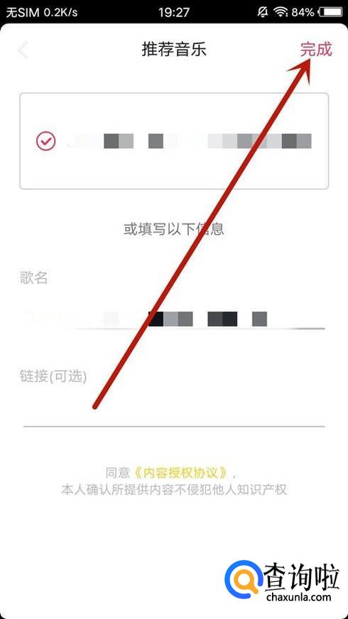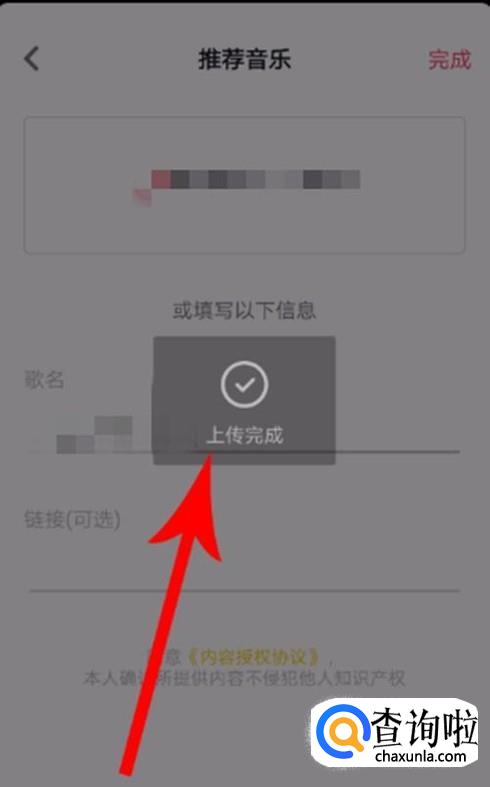 返回到推荐音乐页面填写音乐信息,点击“完成”即可完成上传,如图所示。