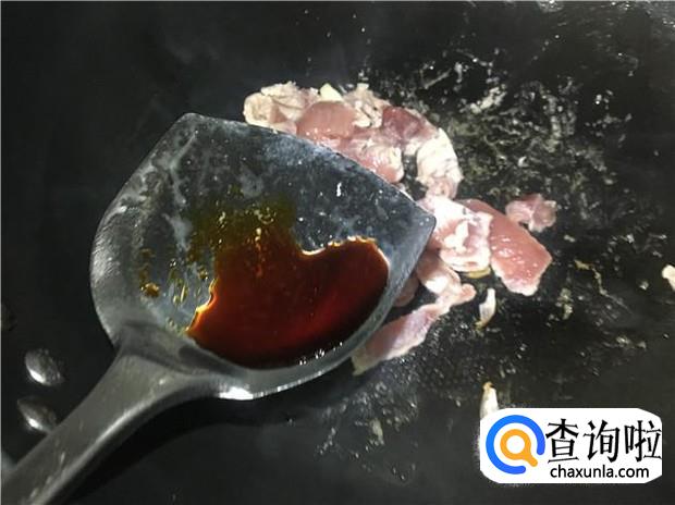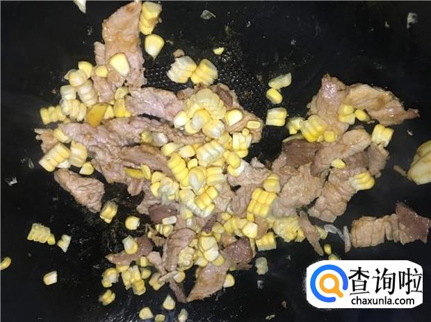 加入适量的酱油和蚝油,把肉片炒到变颜色后,大概炒三分钟左右,即可倒入玉米粒,把瘦肉和玉米粒翻炒均匀。
