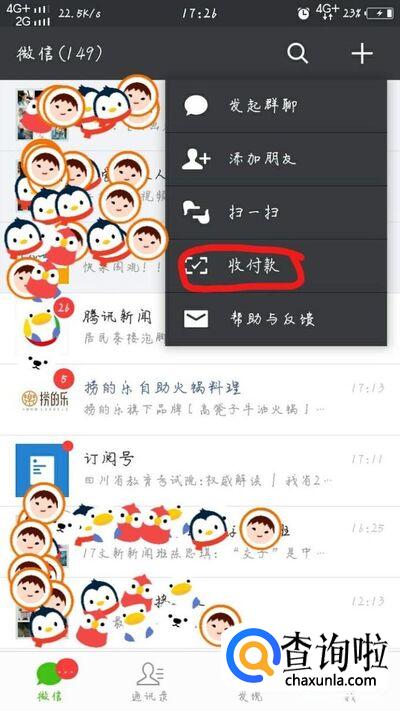 然后会出现一些选项,比如"添加朋友","扫一扫","收付款"等,在这里我们点击"收付款"