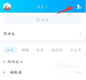 打开手机QQ,滑到联系人界面,点击右上角的标志,如下图所示。