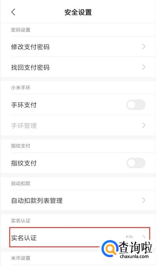 在安全设置界面,找到实名认证。