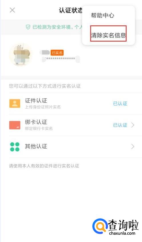 在弹出菜单中,选中“清除实名信息”。