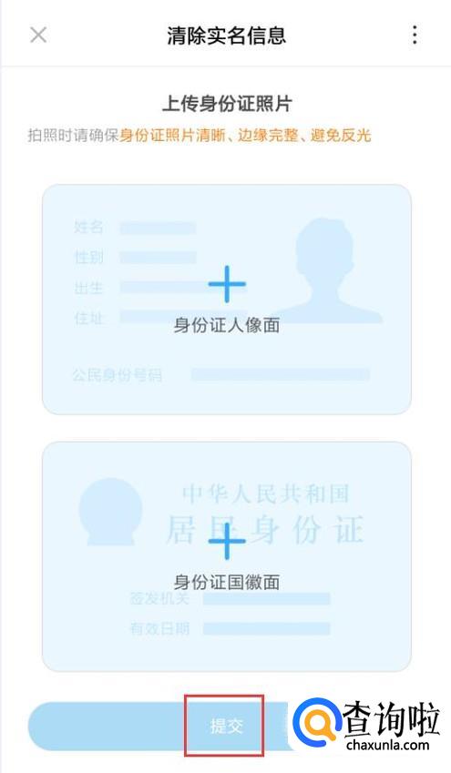 在清除实名信息界面,上传实名认证时提交的身份证件正反面,点击提交。