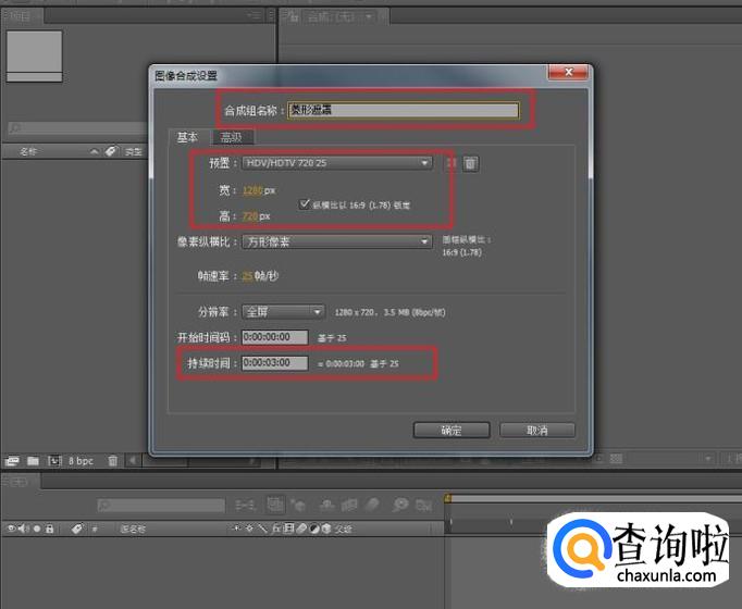 将合成的名称设为:菱形遮罩,预置更改为:HDV/HDTV 720,持续时间设为:3秒。