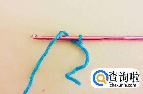 把针穿过“头结”,然后把左侧的毛线从后向前绕一圈挂在钩针上。这个时候钩针头朝上。