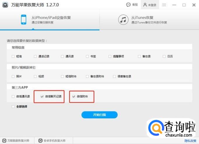 连接iPhone手机到电脑上,并和软件连接起来,之后在数据类型选择界面上勾选“微信聊天记录”和“微信附件”。