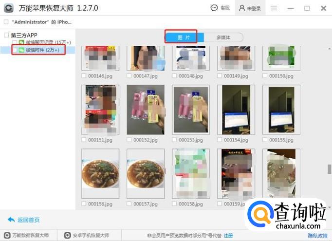完成扫描后,点击微信附件,可以查看到很多图片,从中找到自己要的图片进行预览,并对其恢复。