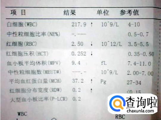 白细胞计数(WBC):正常为:成年人(4.0~10.0)×10^9/L,儿童(5.0~12.0 )×10^9/L。(每个地方和每个医院参考范围或略有差异)