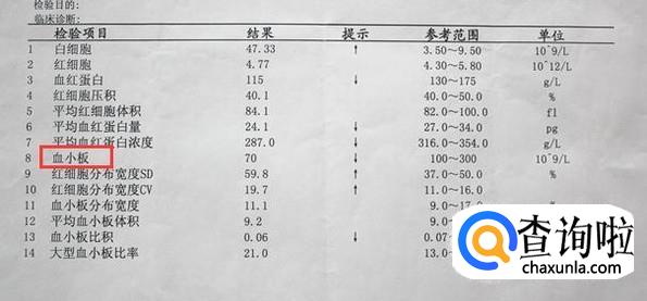 血小板计数(PLT):正常:男(108~273)×10^9/L,女(148~257)×10^9/L。(每个地方和每个医院参考范围或略有差异)