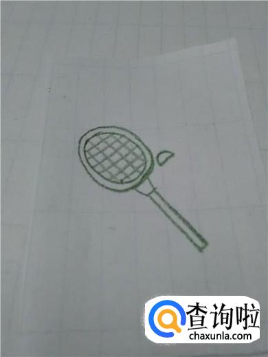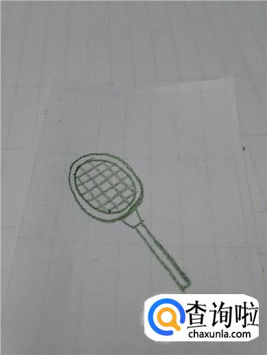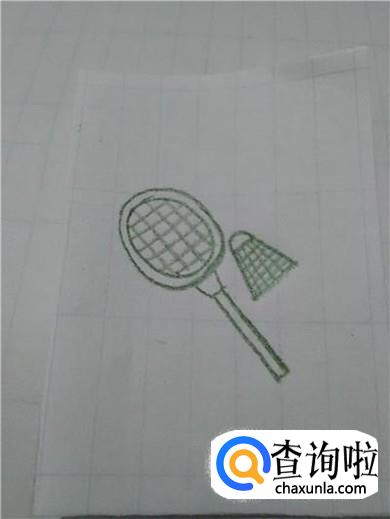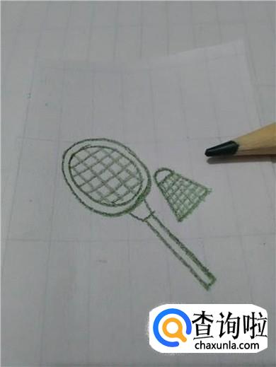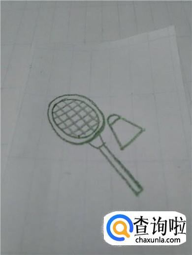 在梯形里面画一些横竖相间的线,表示羽毛球的羽毛,羽毛球和球拍就画完了。