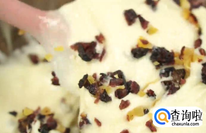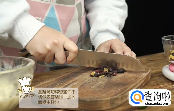 然后,将准备好的蔓越莓干拿出一部分来切碎,其余的保留之后做表面装饰会用到。把切好的蔓越莓干放进面糊中继续搅拌。