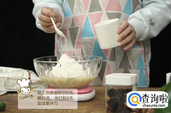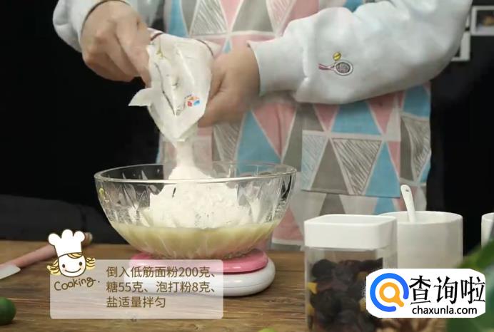 接着,在搅拌好的碗中继续加入200克低筋面粉、55克糖、8克泡打粉和适量的盐,再次搅拌,直至均匀为止。搅拌出来的样子如图所示。