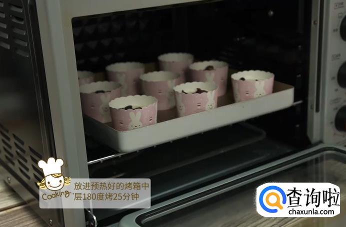将所有的纸杯放在烤盘中,然后放入预热好的烤箱中层,用180度的温度烤25分钟左右即可。