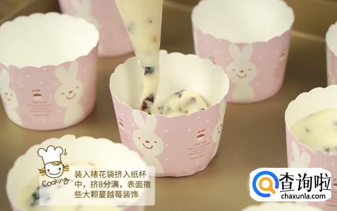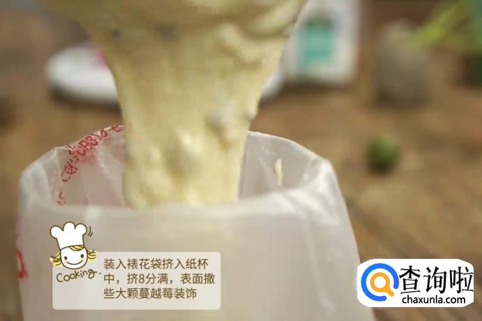 接下来,用裱花袋往纸杯中挤压面糊,大概挤至8分满即可。