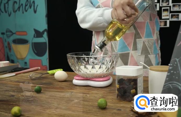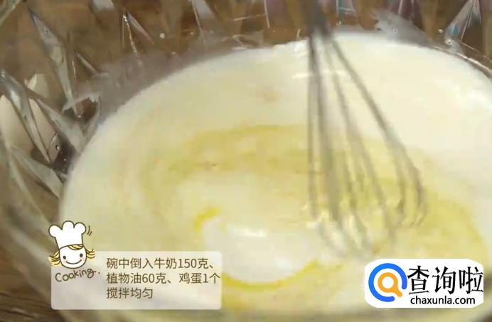 准备好材料后,首先在碗中倒入150克牛奶、60克植物油和鸡蛋1个,然后用搅拌器将它们搅拌均匀。