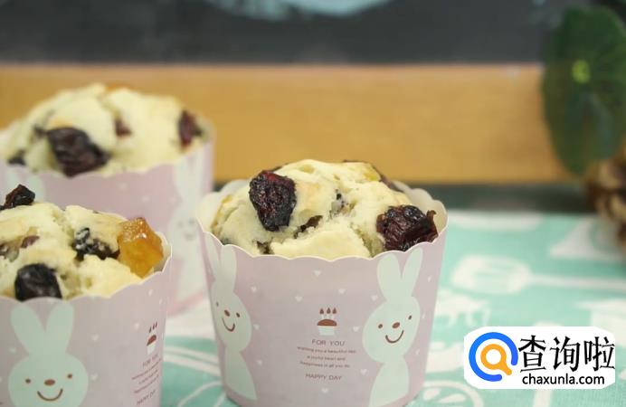 烤完后,用隔热手套将烤盘端出来,热腾腾的果干马芬杯就做好了。