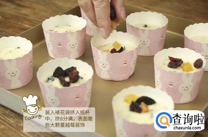 挤完后,在纸杯表面撒一些刚才剩余没切的蔓越莓干作为装饰。
