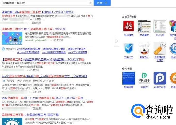 打开电脑上的浏览器,在搜索页输入:蓝屏工具下载就会出现很多的下载网站,小编这里随便找一个给大家做个演示。