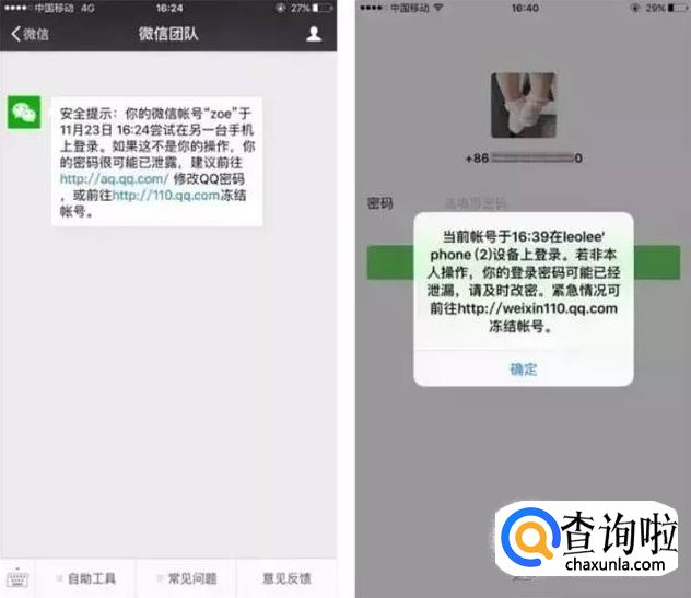 一般情况下,当你收到以下这两种提示,那么你的微信号可能已经被盗了: