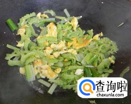 再倒入炒好的鸡蛋碎,加入适量的盐和白糖,一盘好吃的苦瓜炒蛋就做好了。