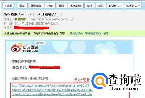 打开邮件,里面有一个网站链接,点击网站链接进入就可以激活微博账号了。(这里建议大家核实一下链接的安全性再点击)