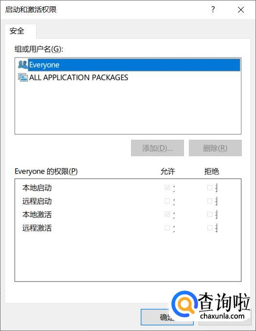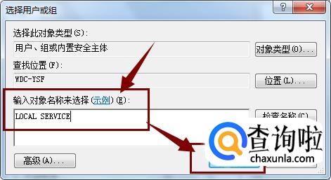 然后在输入对象名称来选择的输入框中输入LOCAL SERVICE用户名,点击检查名称,再点击确定。LOCAL SERVICE账号添加完成后,将其下方的本地启动,本地激活勾选上,点击确定。