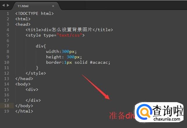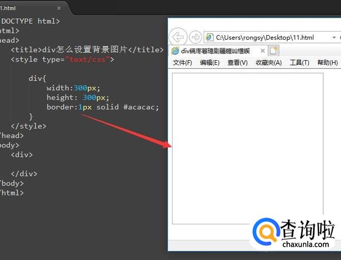 然后我们在html的body区域添加一个div,并且给div设置一下宽高以及边框的样式,如下图所示