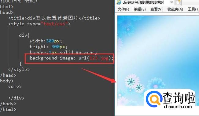 然后我们回到html文档,在div的样式规则里面添加background-image属性,如下图所示,给此属性指定一个图片路径,运行以后你就会看到背景图片了