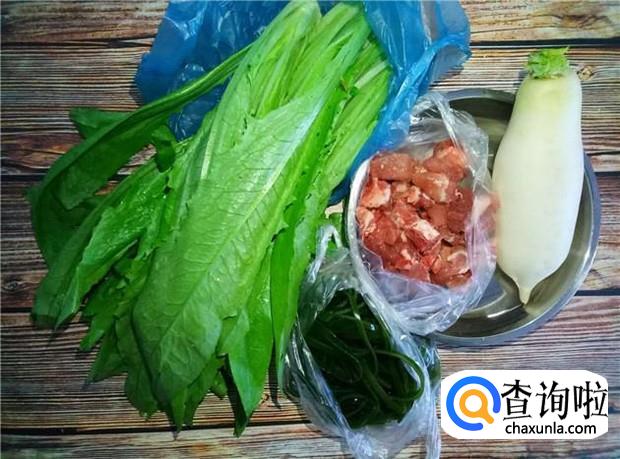准备好所有材料:排骨一根、白萝卜一个、海带适量、油麦菜一斤。