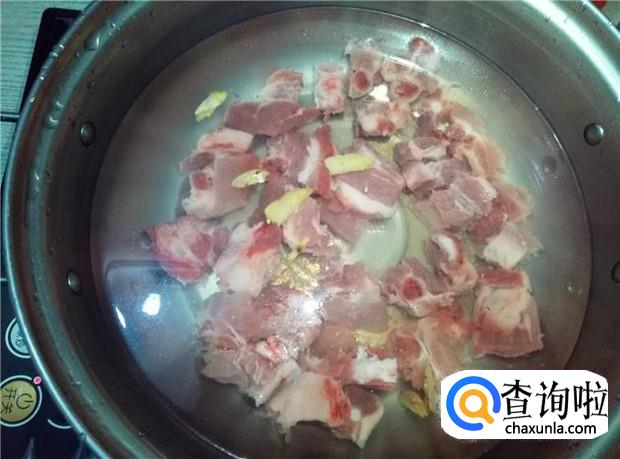 排骨清洗干净,加入锅中,放入适量的姜片和盐,大火煮。