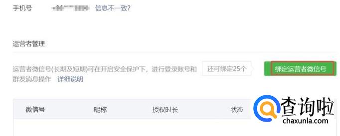 弹出的界面,我们点击绑定运营者微信号;