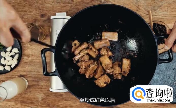接着放入排骨,翻炒成红色后,倒入高汤。