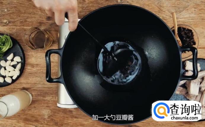 开大火,锅中倒入菜籽油,油温温热的时候,加一大勺豆瓣酱,用铲子把豆瓣酱滑散开,超出红油和香味。