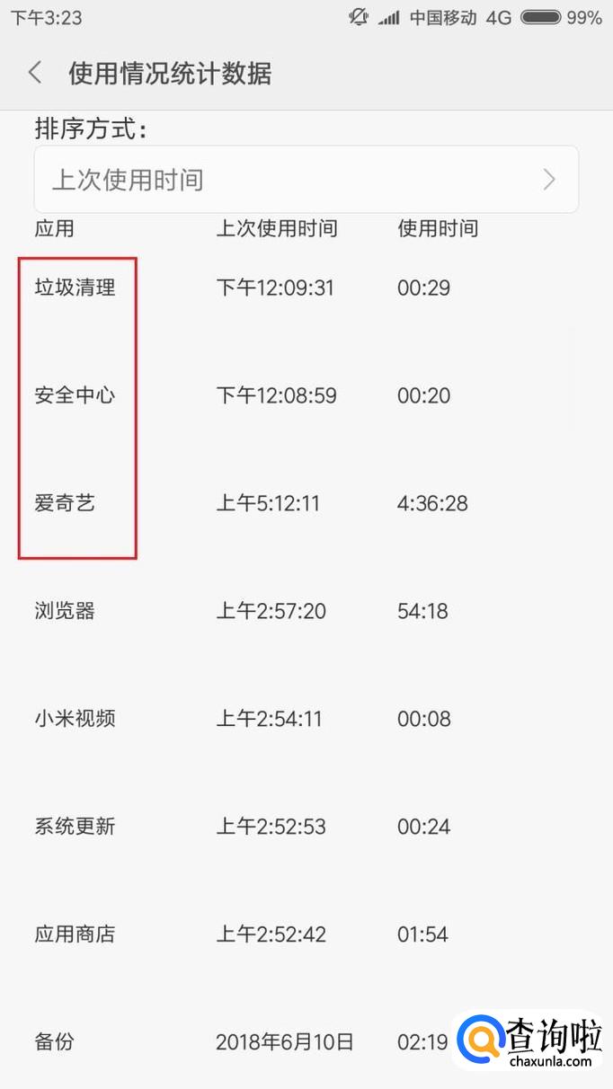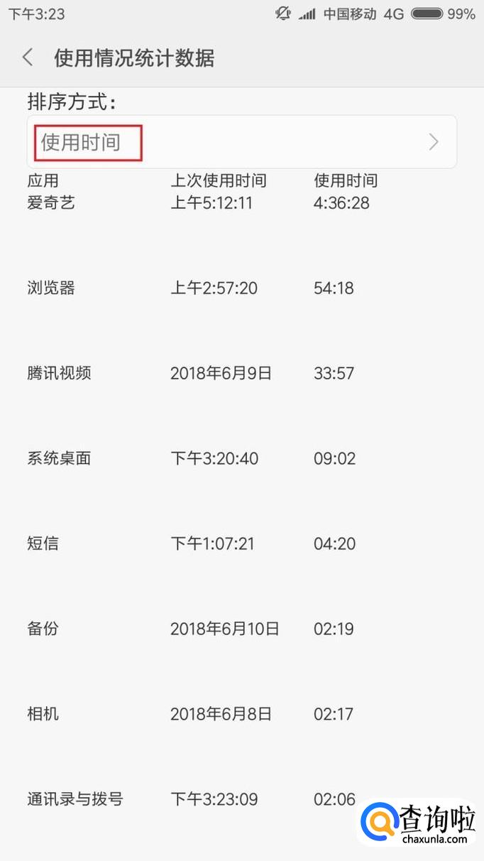 最后,就可以在该页面中看到手机中安装的应用使用时间长度、上次使用时间等信息。