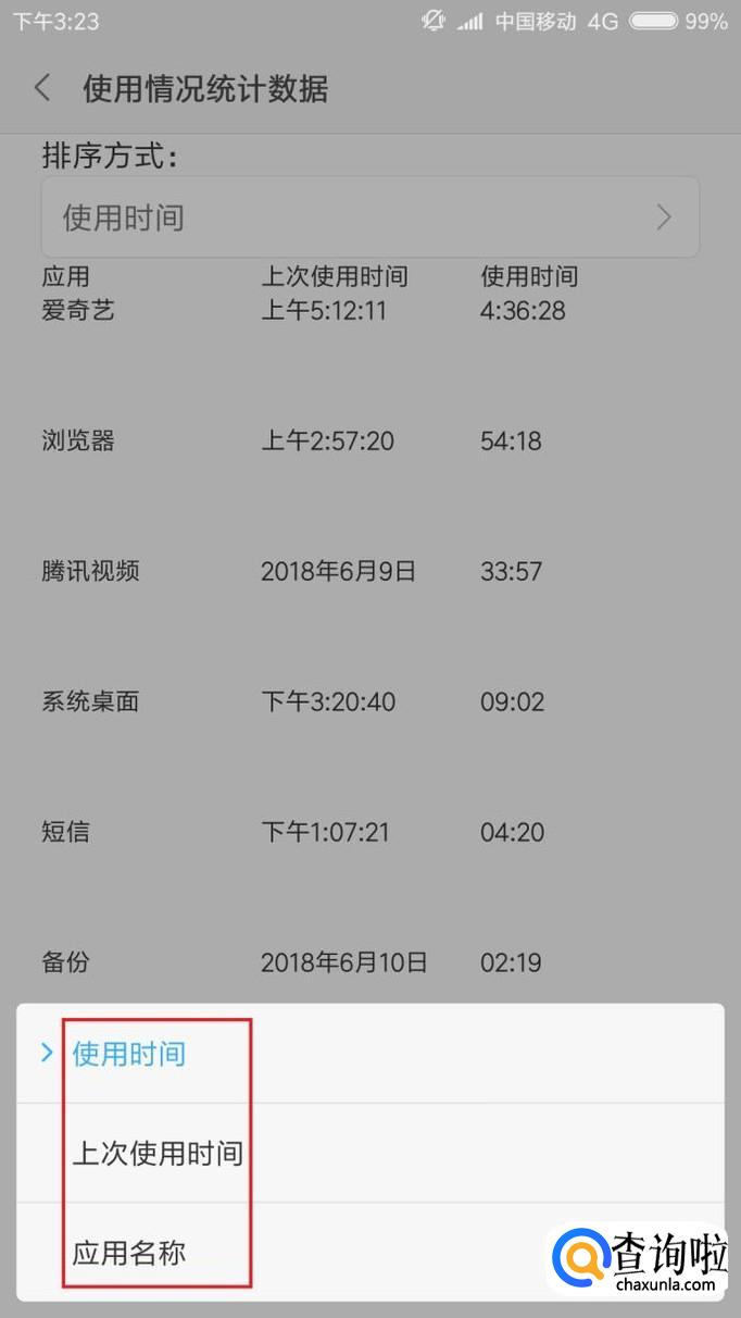 接下来,在页面底部弹出的菜单页面中,可以选择按照“应用名称、使用时间和上次使用时间”进行排列。