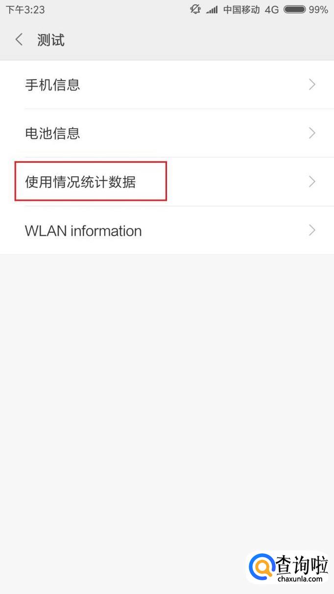 进入测试应用界面之后,点击页面中的“使用情况统计数据”菜单按钮。