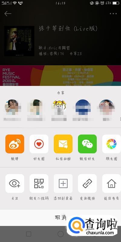 进入到歌曲界面后点击右上角分享选项。选择分享对象。