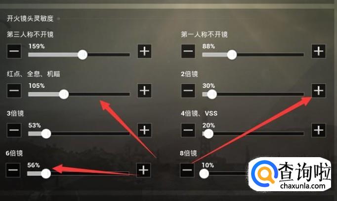 进入之后,将“红点、全息、机瞄”设置为105%,将“6倍镜”设置为56%,如图所示。