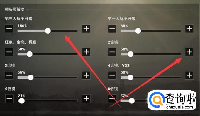 对于镜头灵敏度设置,将“第三人称不开镜”设置为150%,2倍镜设置为50%,如图所示。
