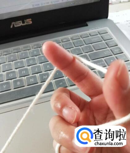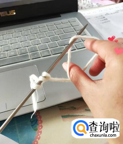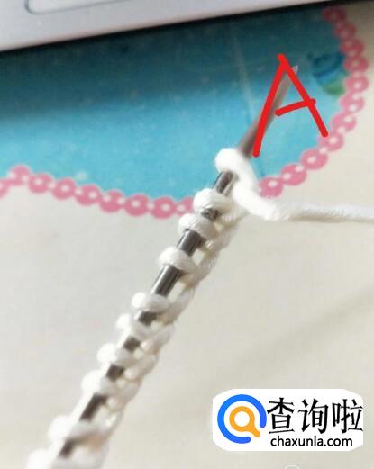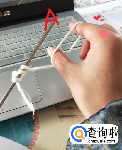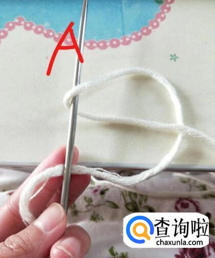 起针:左手握住A针,将毛线前端压在A针下,绕过右手拇指和食指。