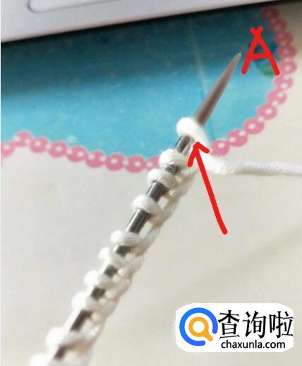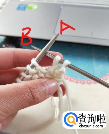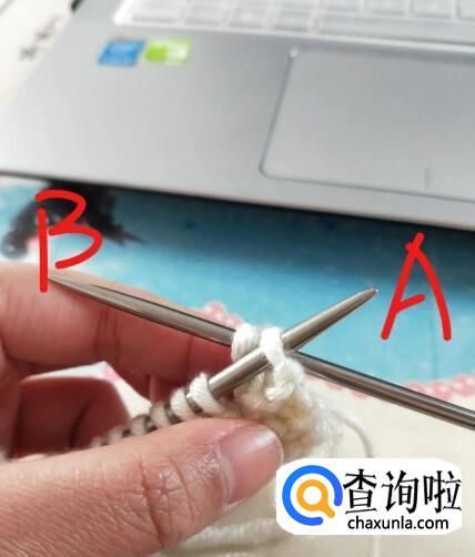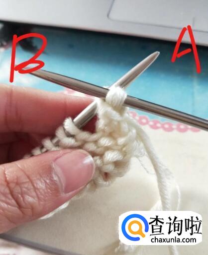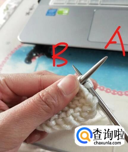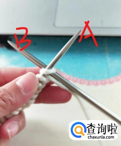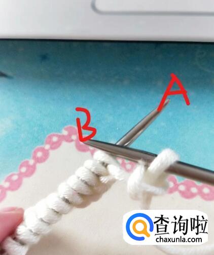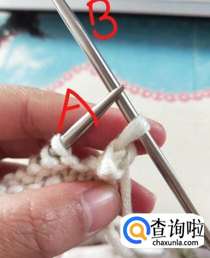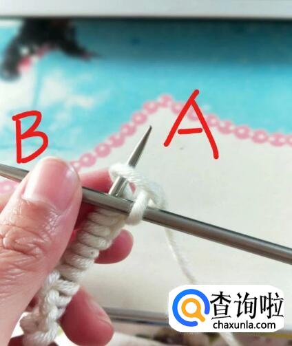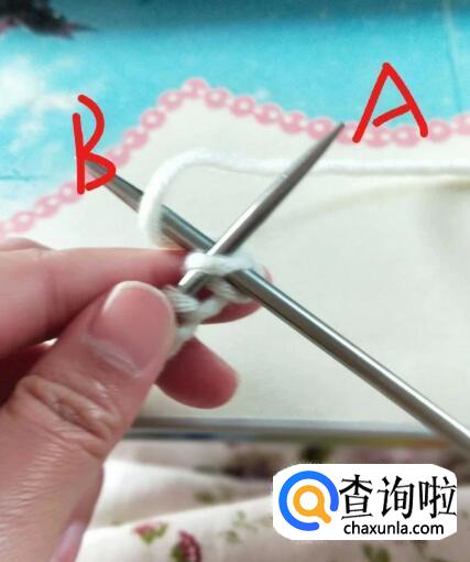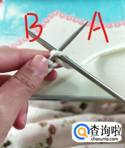 行针:右手握B针,从箭头处穿过,右手将毛线从B针下方绕上来并置于A针下方,稍稍拉一下,B针将刚才绕的线挑起,A针退出,第一针就织好了。