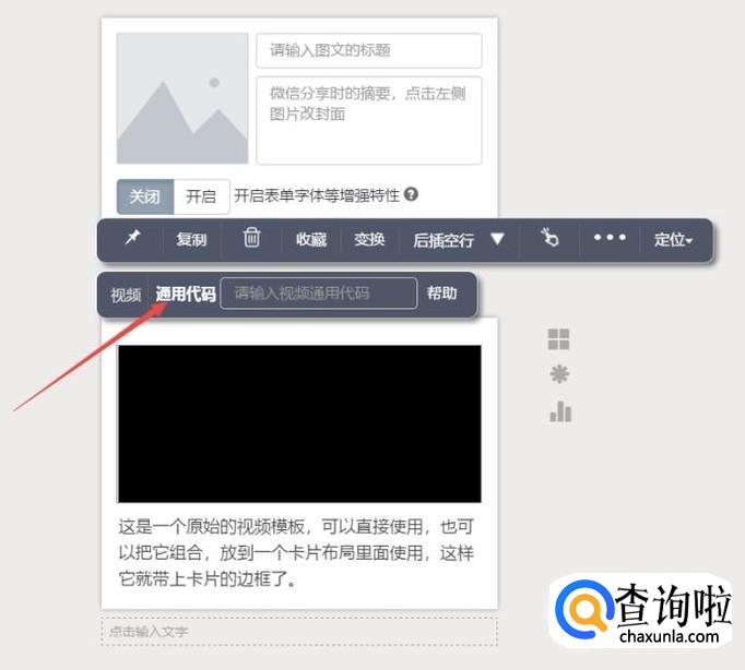点击一下你想用的视频图文模板样式,然后就会自动出现在编辑框了,然后点击一下模板,然后会有出现一些功能,找到视频输入你想插入视频的通用代码,就完成插入视频了。