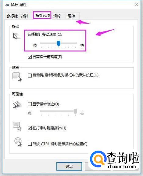 在鼠标指针选项这里,我们可以设置鼠标指针的移动速度,如图所示。