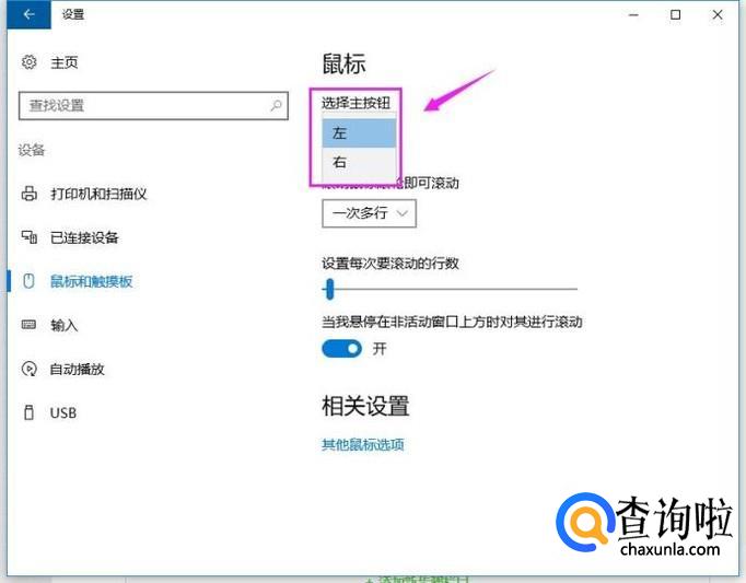 在这里,我们可以设置鼠标主按键是左还是右,一般我们习惯是左边,如图所示。